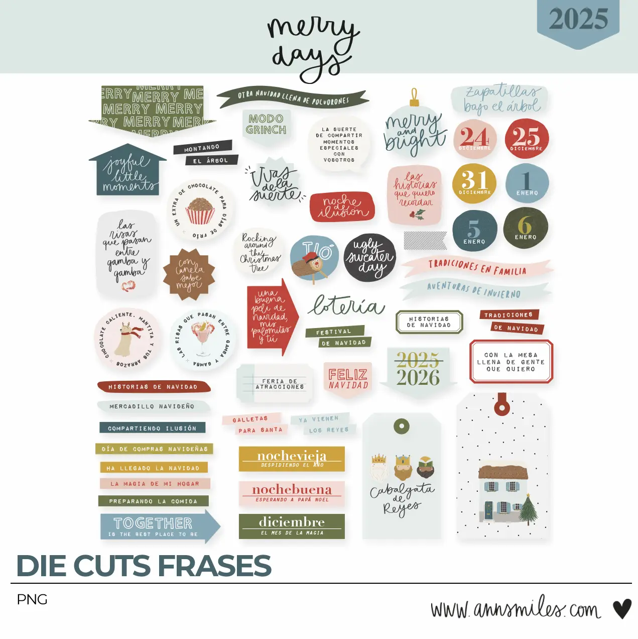 Los Die Cuts Merry Days 2025 Frases para Scrapbooking incluye imágenes por cada Die Cuts en formato .png y .pdf.
