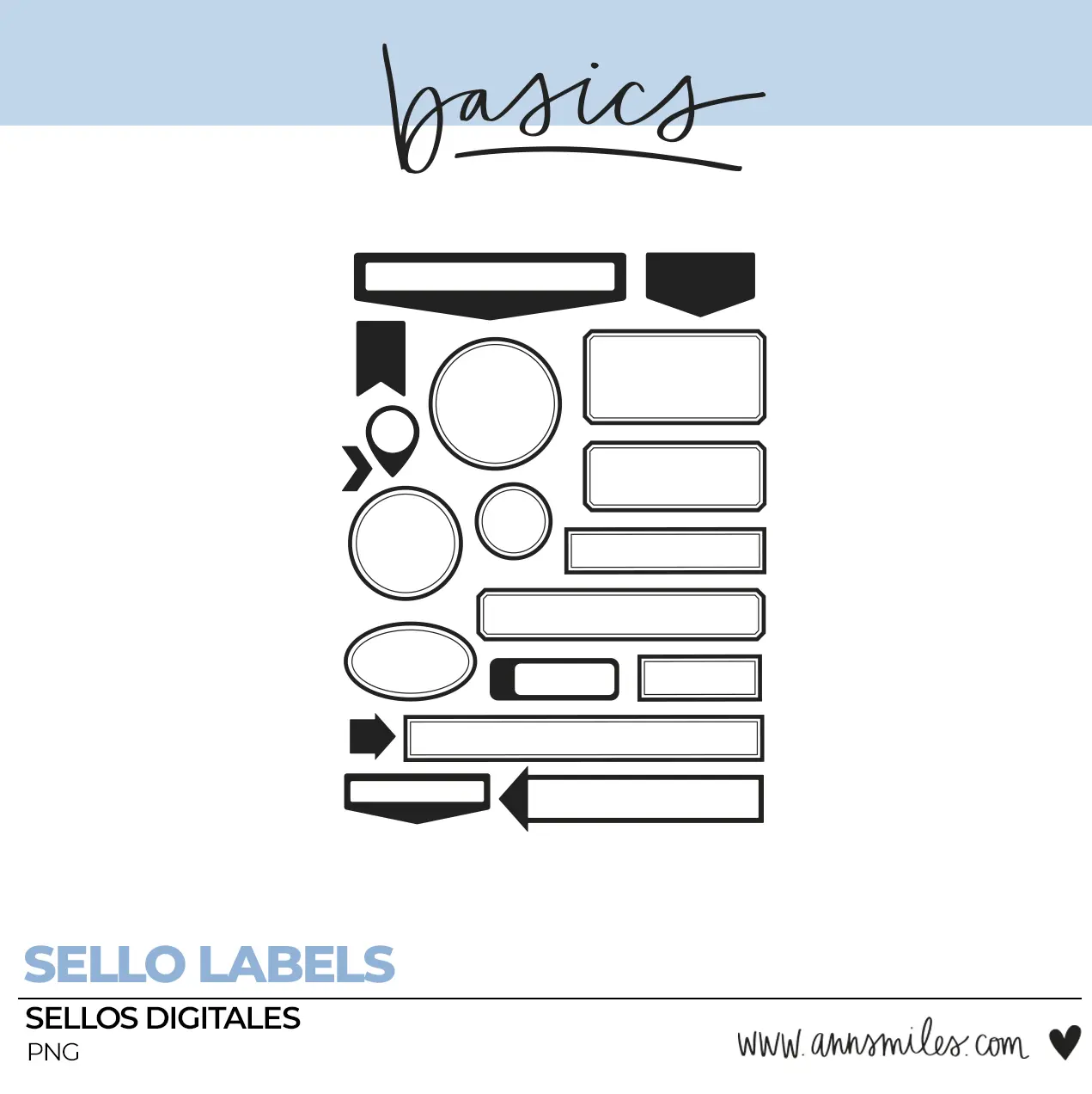 Las colección de Sellos Digitales Basics de Ann’s Miles incluye un total de 19 sellos en formato png.