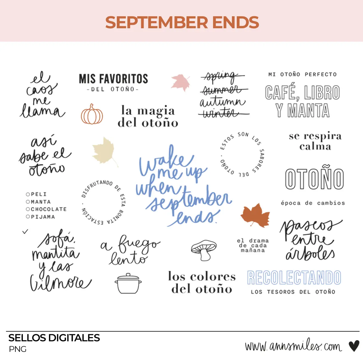 Los Sellos Digitales September Ends para Scrapbooking incluyen dos imágenes por cada sello, uno en color negro y otro color blanco en formato .PNG.