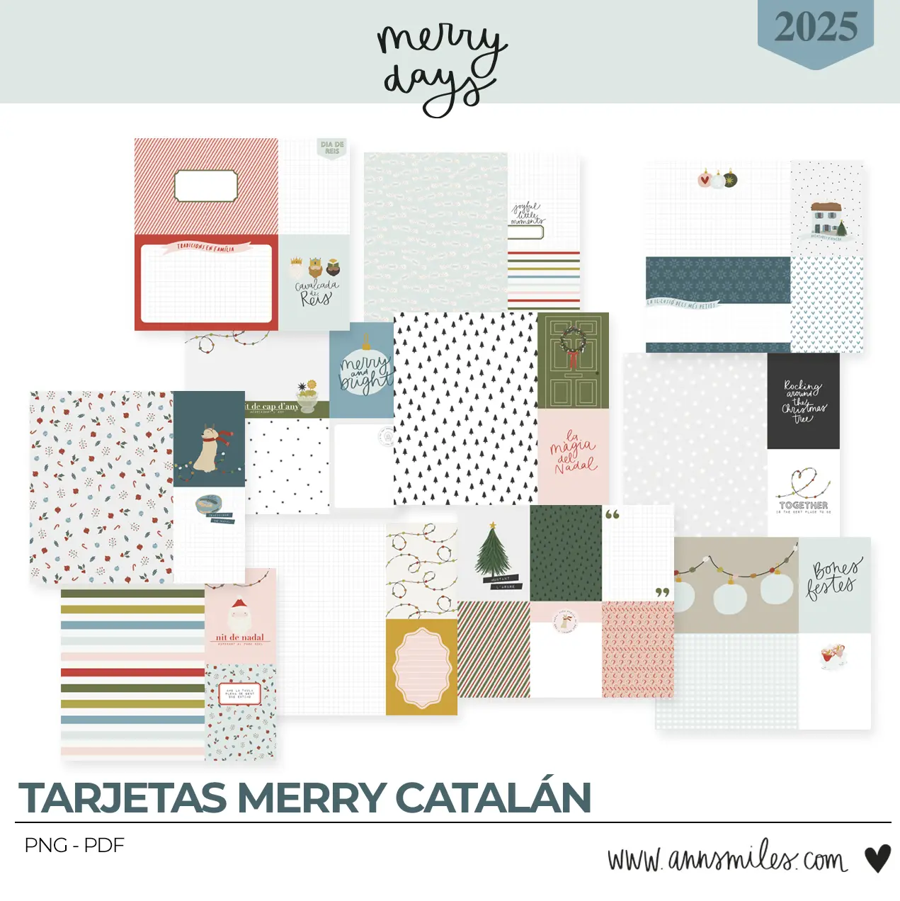 La colección de Tarjetas Digitales de Scrapbooking Merry Days en Catalán de Ann’s Miles incluye un total de 5 tarjetas de 6×8″, 8 tarjetas de 4×6″ y 25 tarjetas de 3×4″ en un montaje A4 en formato pdf. Este formato te permite imprimir directamente las tarjetas digitales sin necesidad de utilizar ningún programa de diseño adicional.