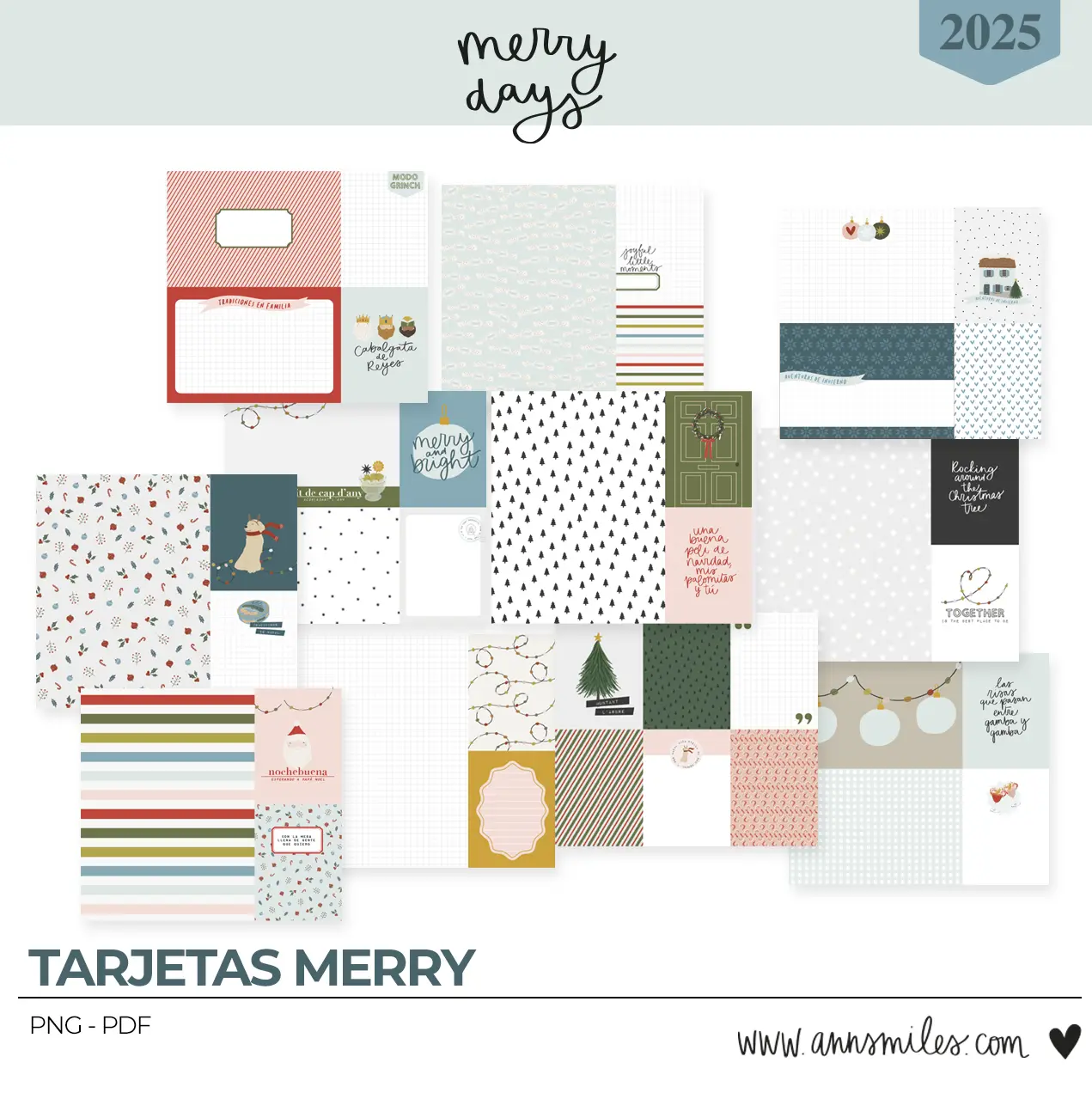 La colección de Tarjetas Digitales de Scrapbooking Merry Days 2025 de Ann’s Miles incluye un total de 5 tarjetas de 6×8″, 8 tarjetas de 4×6″ y 25 tarjetas de 3×4″ en un montaje A4 en formato pdf. Este formato te permite imprimir directamente las tarjetas digitales sin necesidad de utilizar ningún programa de diseño adicional.